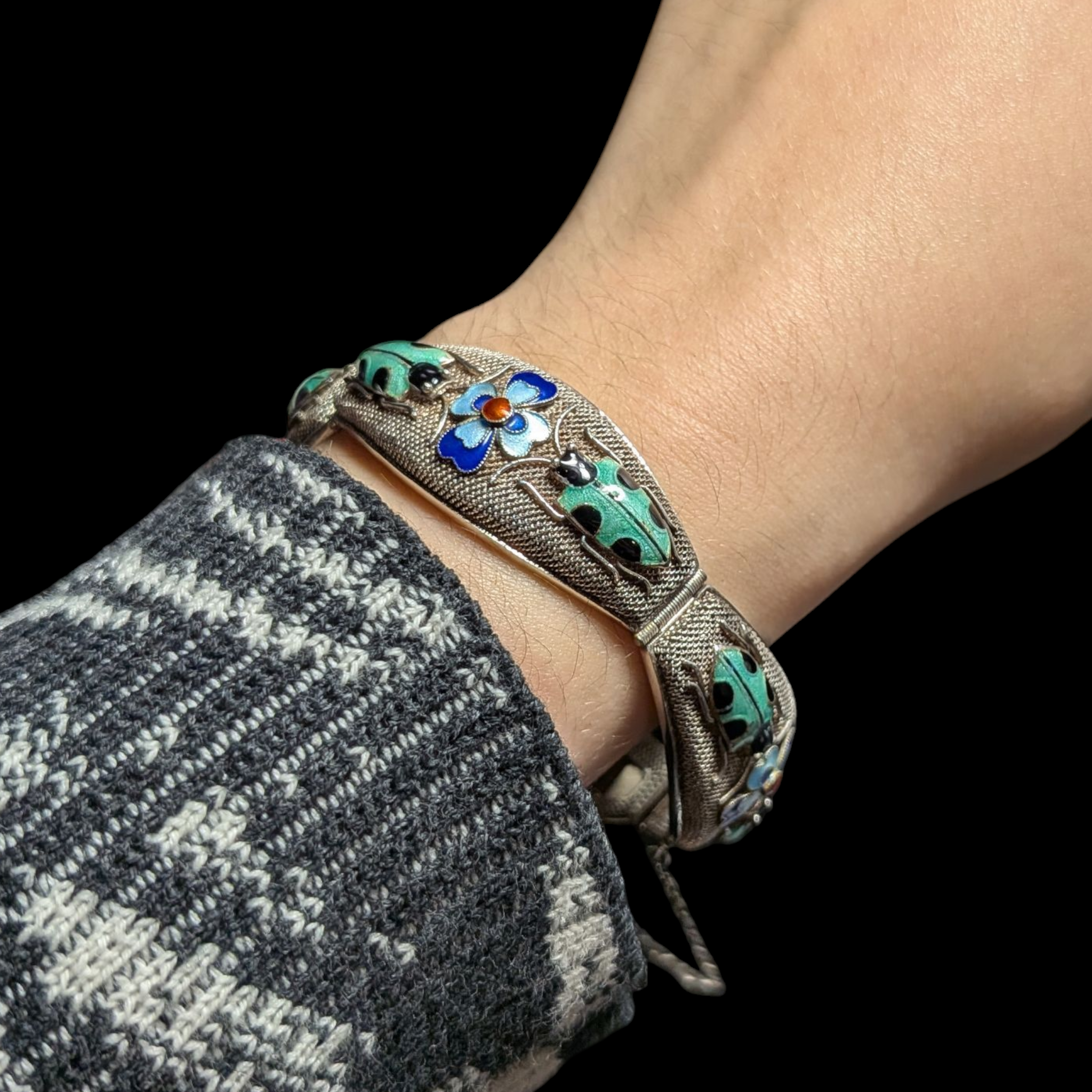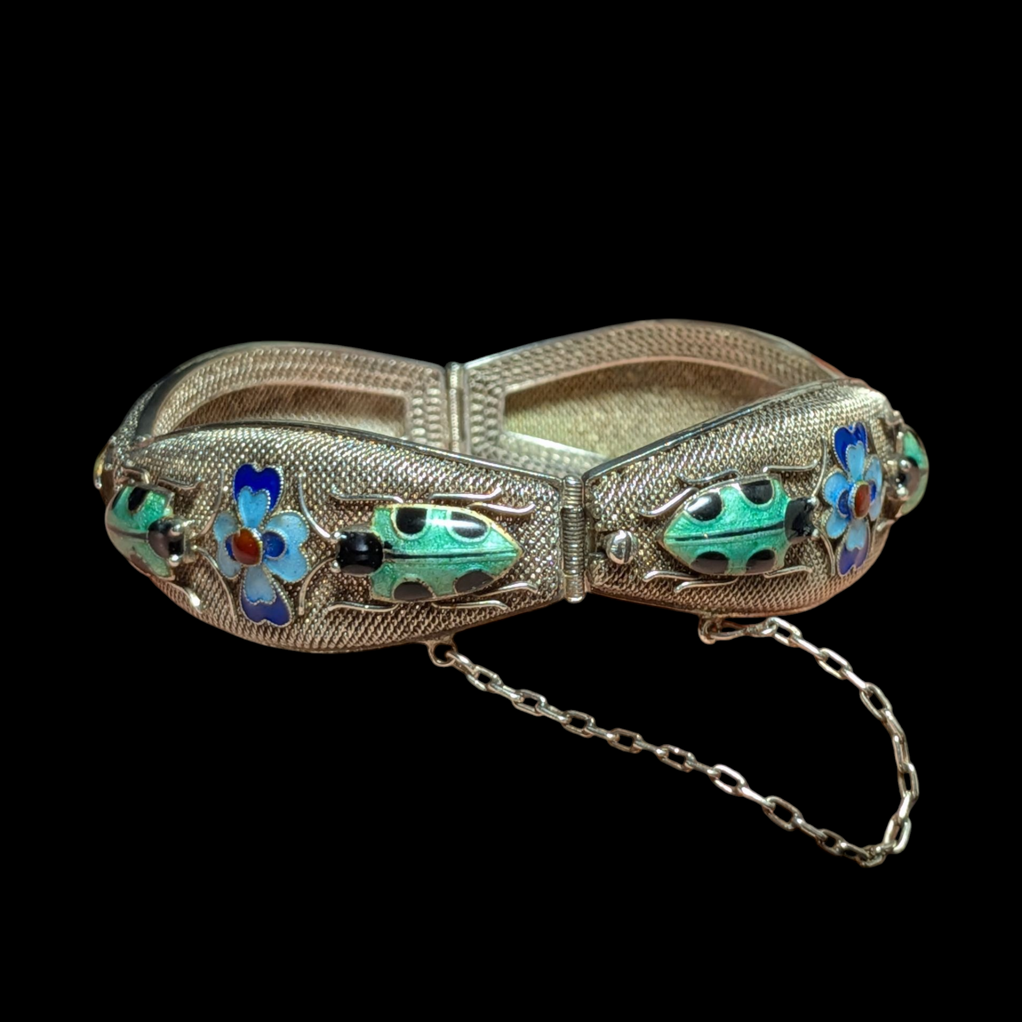 Early Silver Beetle / Bug and Floral Bracelet Enamelled Bracelet