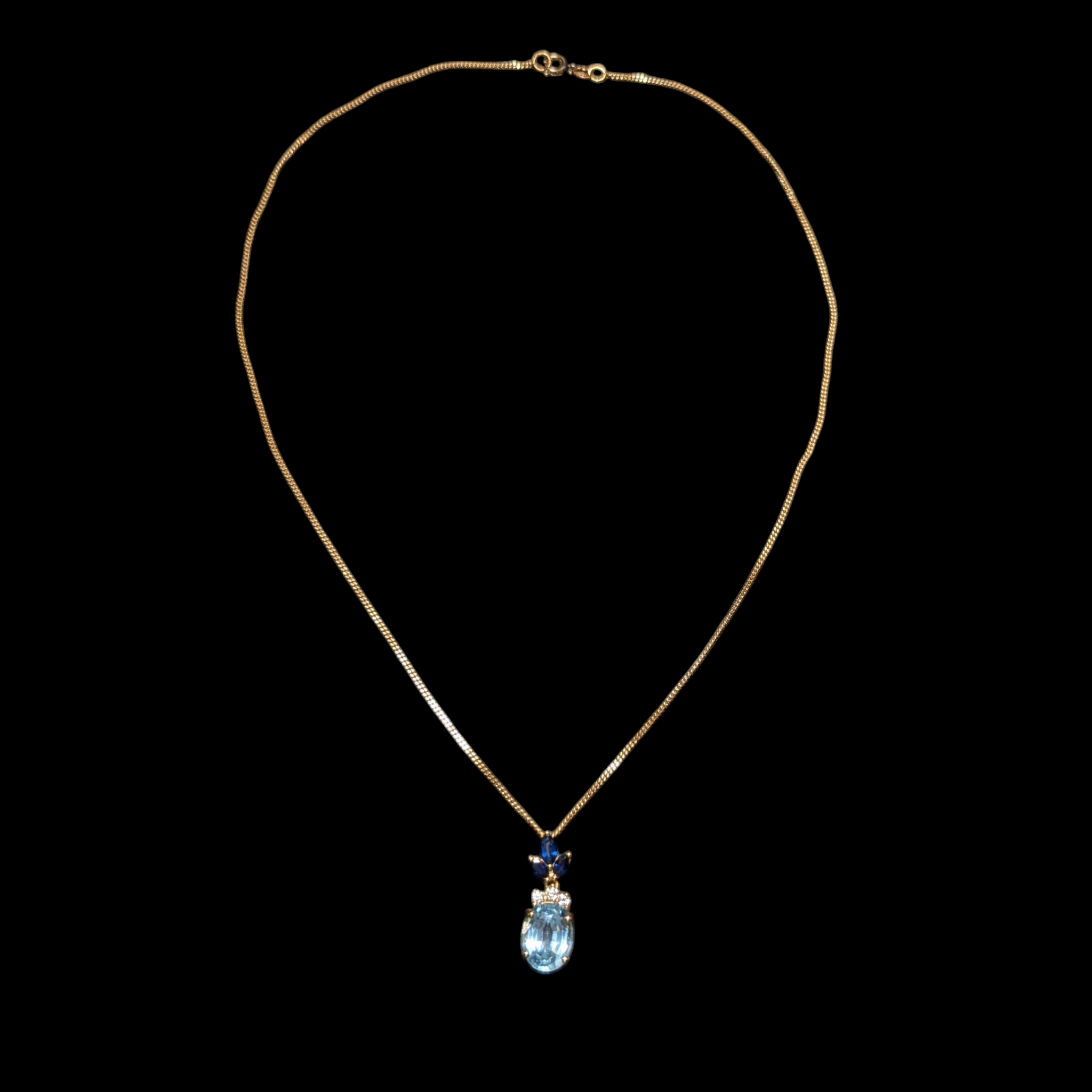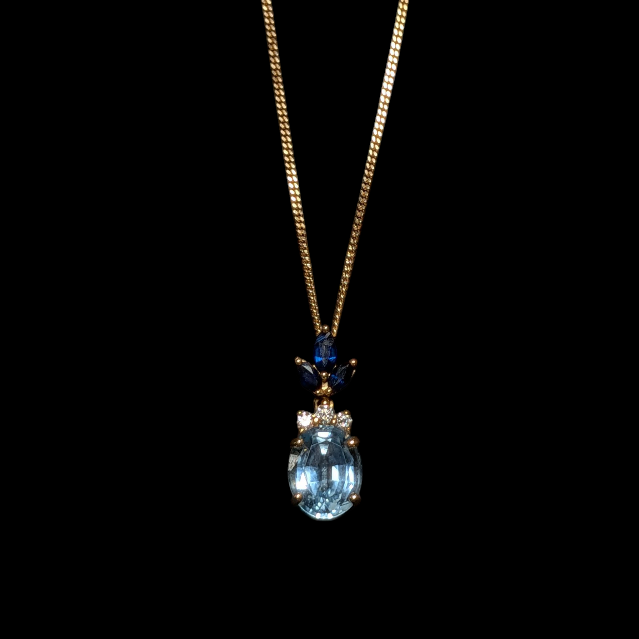 - Dimensions: Length: 16", Pendant: 7/8", Aquamarine: 10x8mm, Diamond (x3): 2mm, Sapphire (x3): 4.2-3.6mm