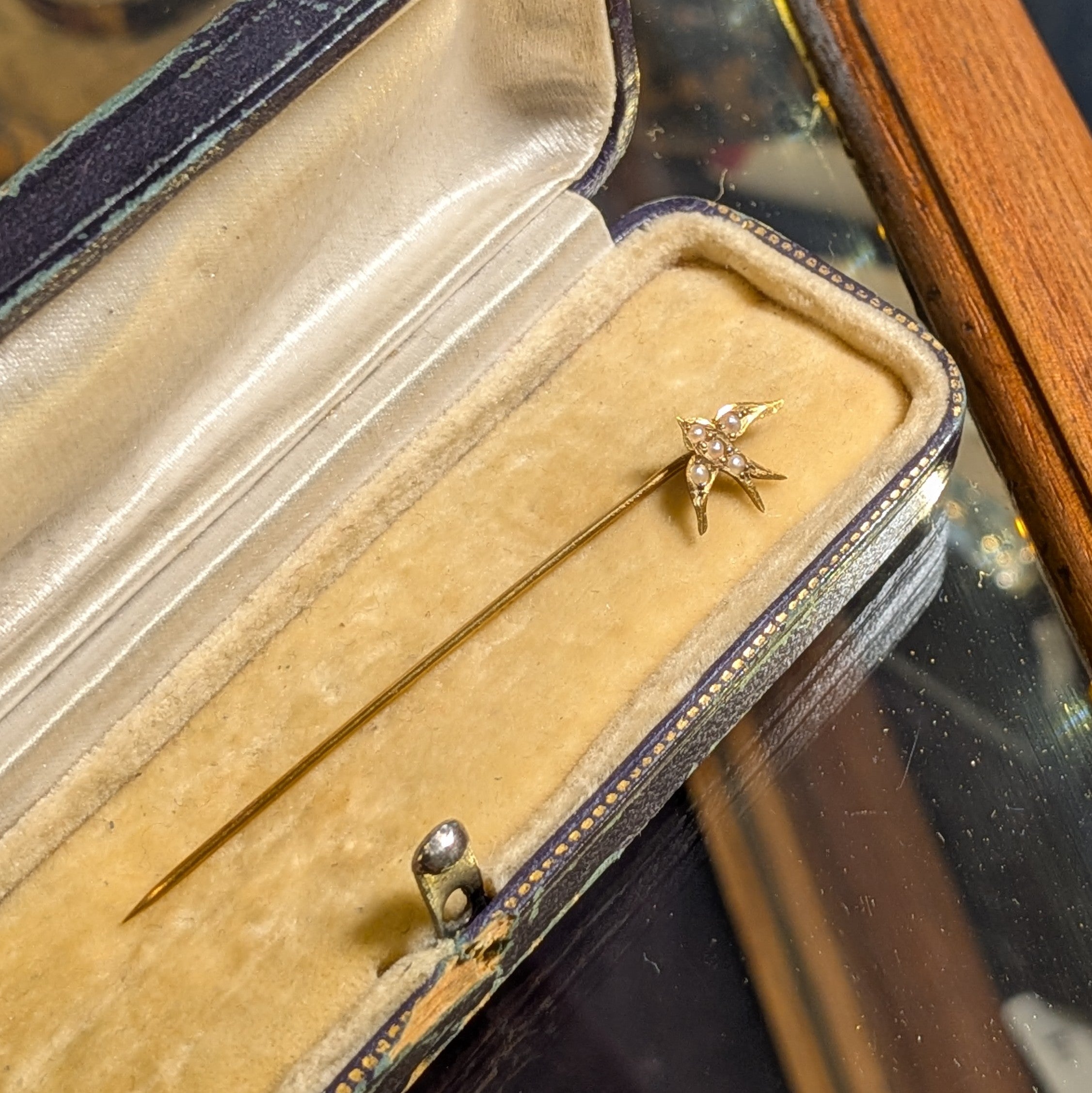 Antique 14K Edwardian Gold Swallow Bird In Flight Seed Pearl Stick Pin