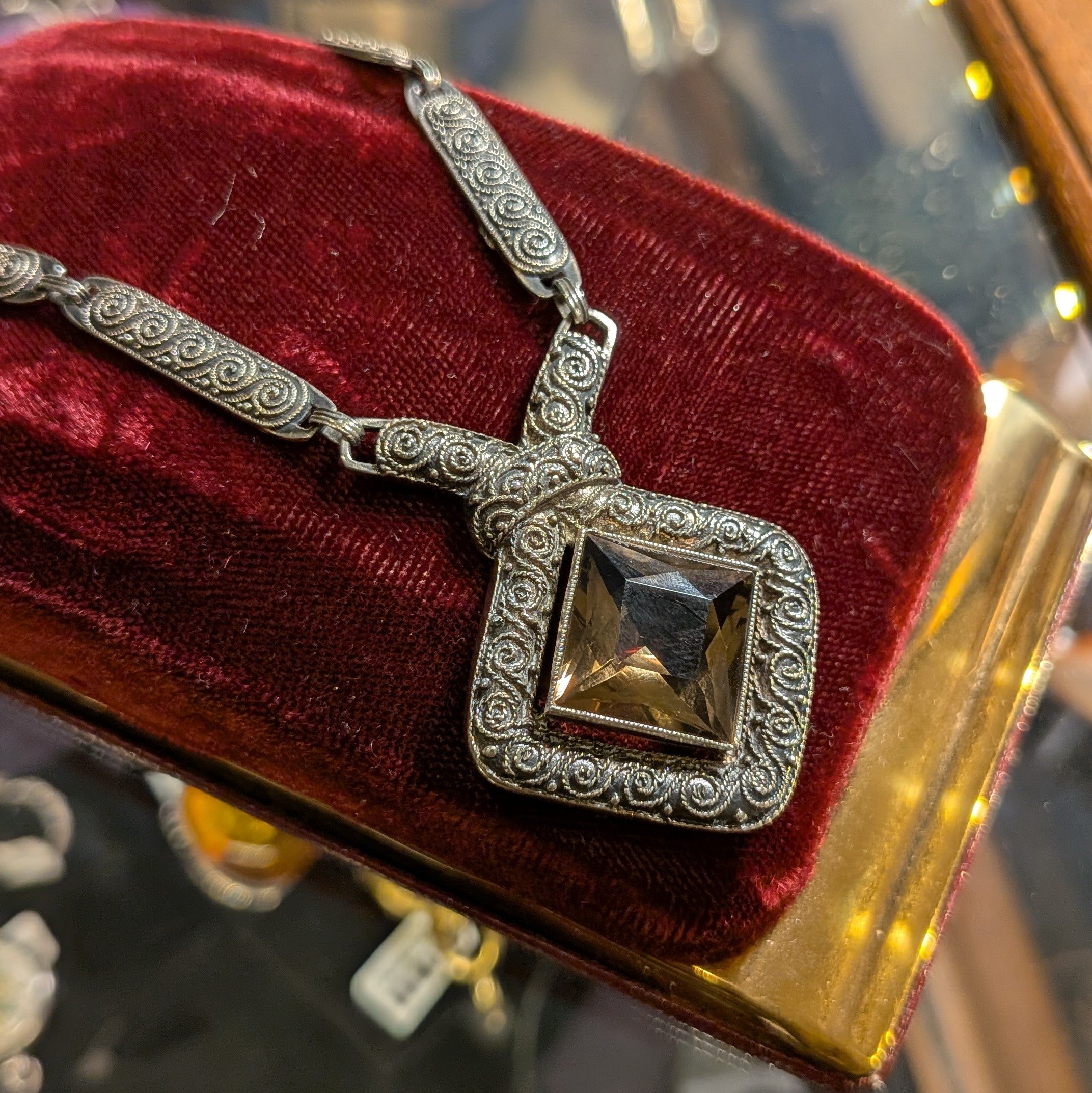 Incredible attention to detail. Clear stone beautiful orange / brown hues. A real pleasure to wear! Clasp functions as it should. Has not been cleaned. Patina from age.
